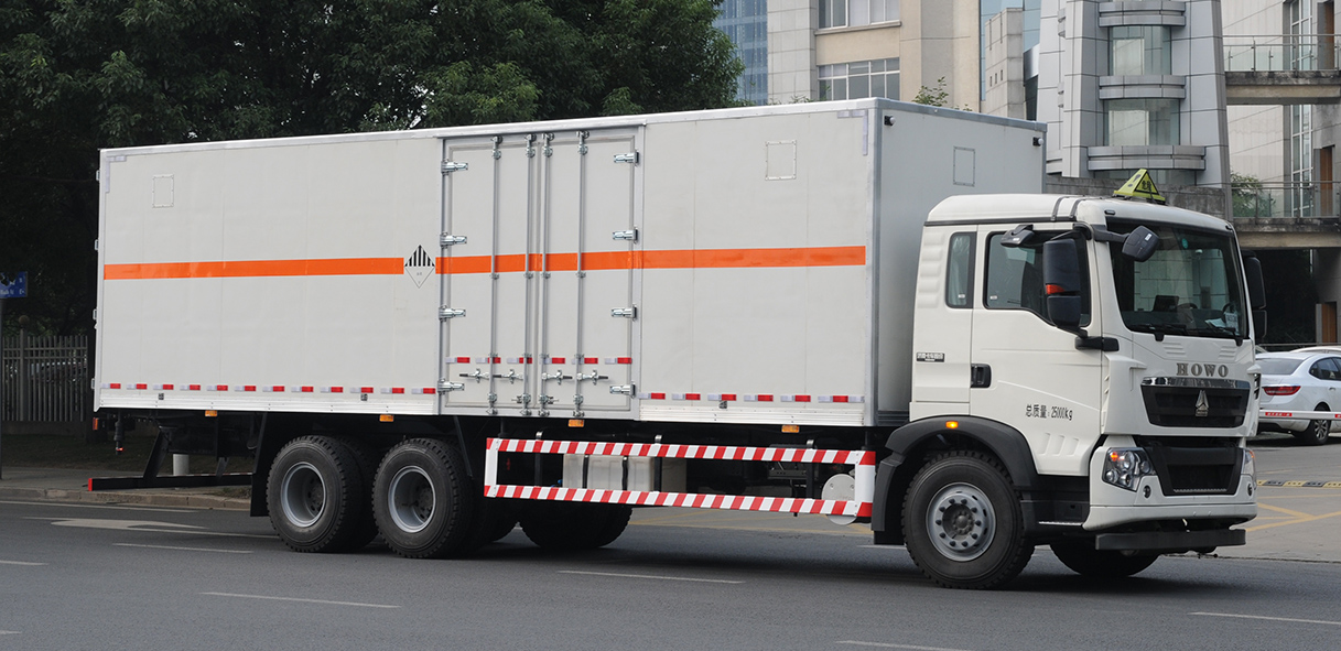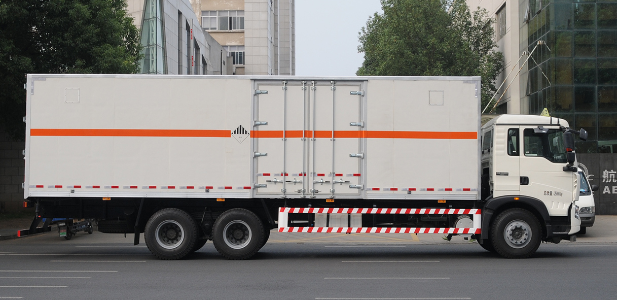 CGJ5251XZWE4型杂项危险物品厢式运输车是在ZZ1257M584GD1二类底盘上改制而成,它在保证其ZZ1257M584GD1型车底盘技术性能的前提下,用于运输第九类杂项危险物品。